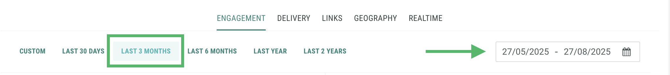 When a filter is selected, the date field on the right reflects the exact dates for the selected filter.