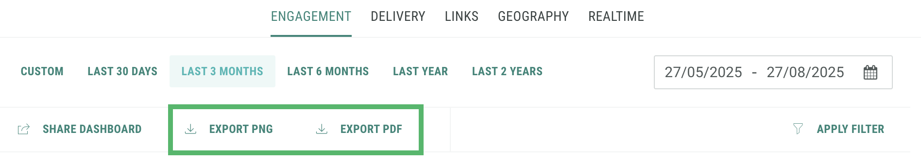 Dashboards can be exported in .png or .pdf format, allowing marketers to keep a history of the different reports over time or to simply share a hard copy of the report with team members.