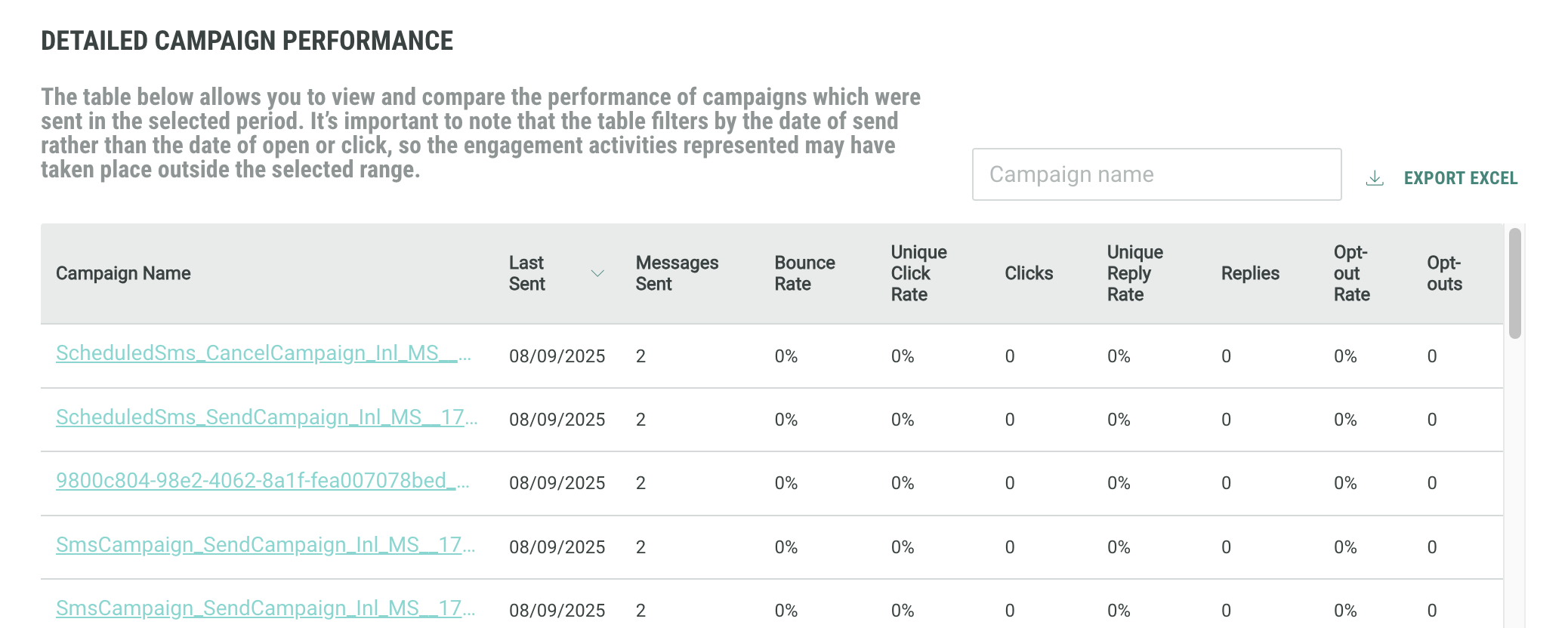 The Detailed Campaign Performance table compares the performance of campaigns which were sent in the selected period. This table includes data on messages sent, bounce rate, click rate, reply rate, and opt-out rate.