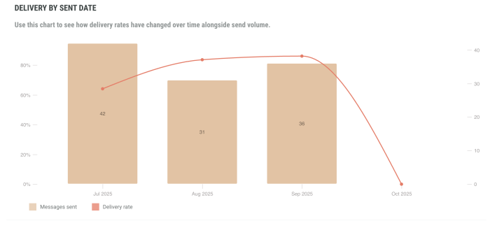 The Delivery by Sent Date report shows how delivery rates have changed over time alongside the send volume.