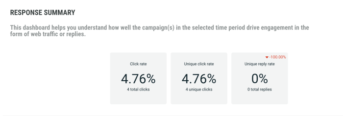 The Response Summary report provides insights on how much engagement are generating over the selected time period. The following KPI are provided: