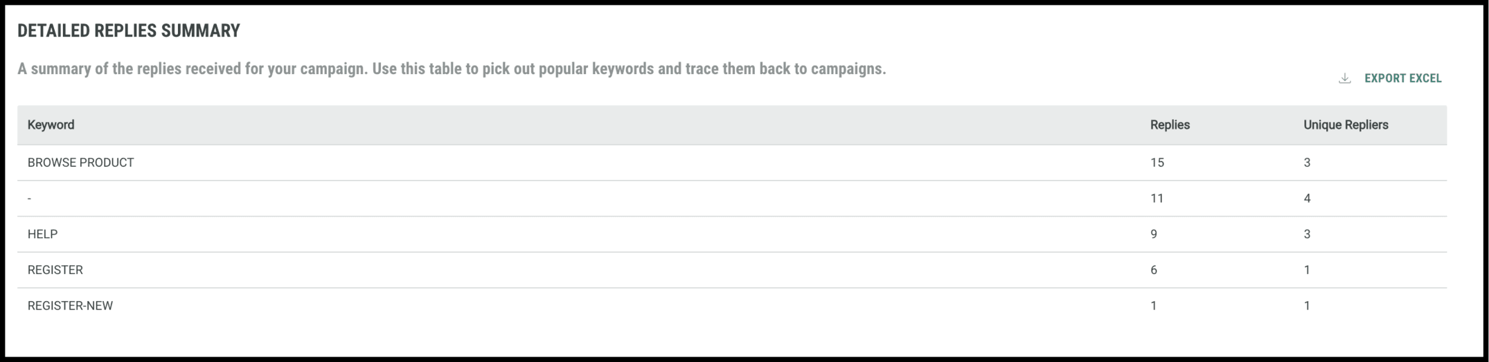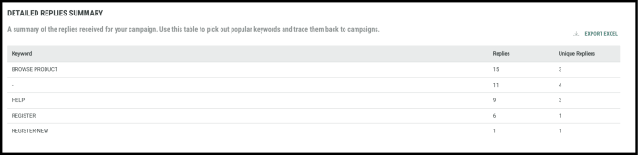 The Detailed Replies Summary shows the popular keywords used in replies so that you can trace them back to your campaigns.