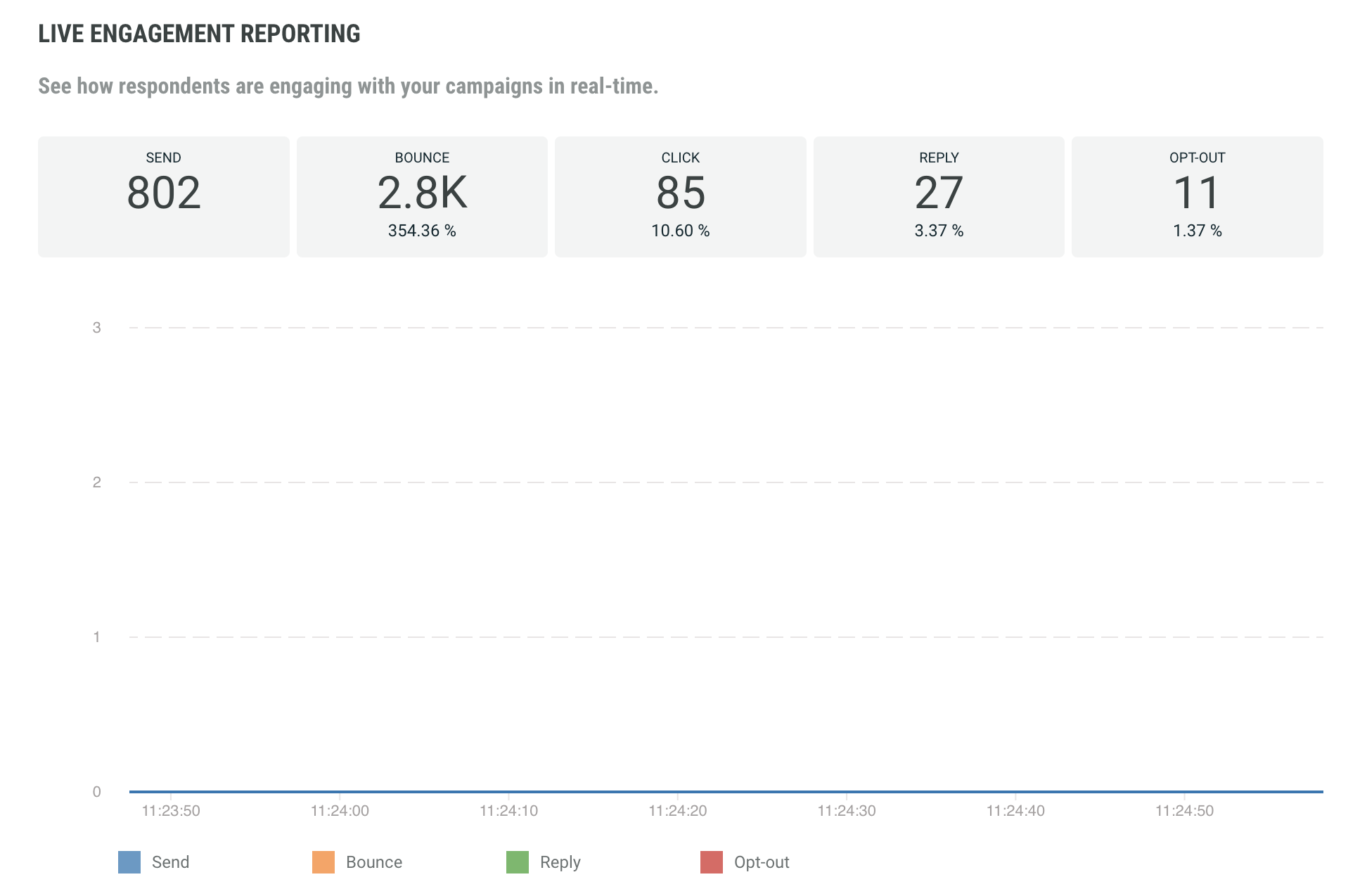 This report provides live engagement reporting (messages sent, opened, clicked, hard and soft bounced, unsubscribed) and show how respondents are engaging with your campaigns in real time.