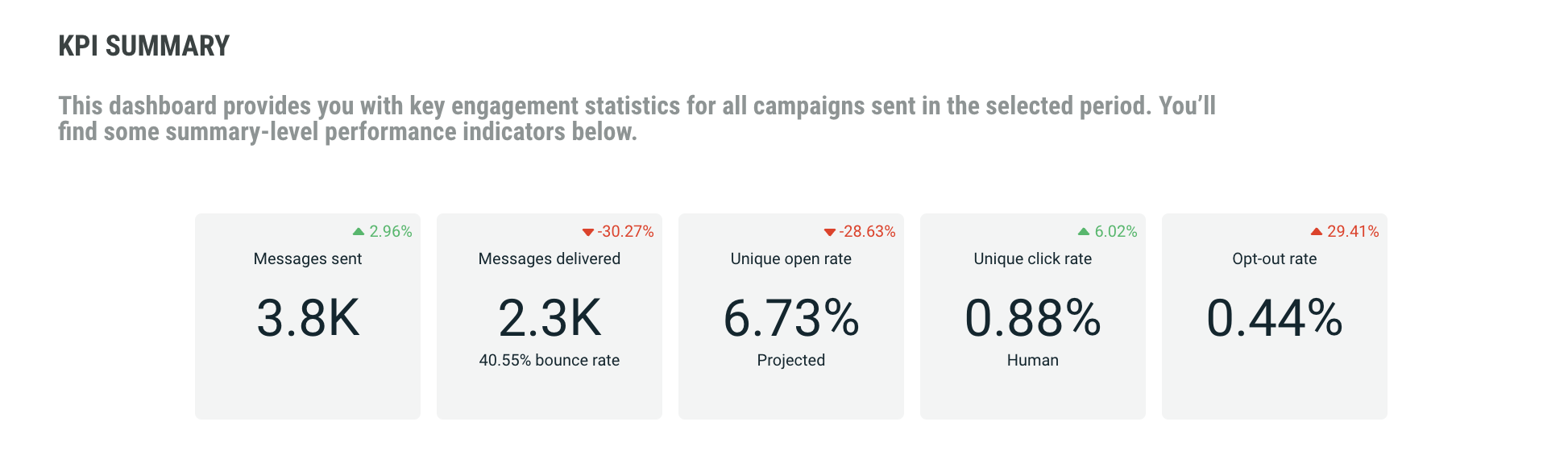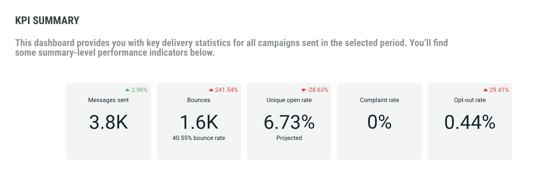 The KPI Summary report shows key delivery statistics for all campaigns sent in the selected time period. It includes: