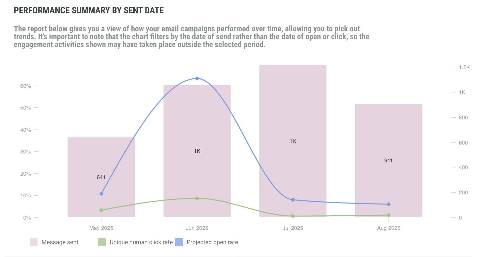 The Engagement dashboard also provides performance summary by sent date, highlighting number of human clicks and comparing it to your projected open rate. The time line is based on the selected filter.