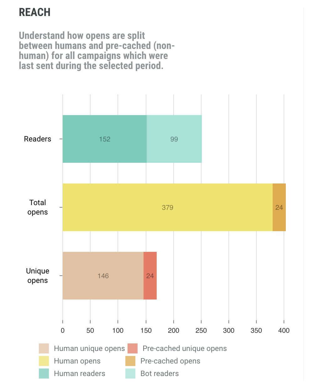 The Reach report is a comparison between total opens vs unique opens, as well as human vs pre-cached opens. A pre-cached open is a false open by Apple MPP.