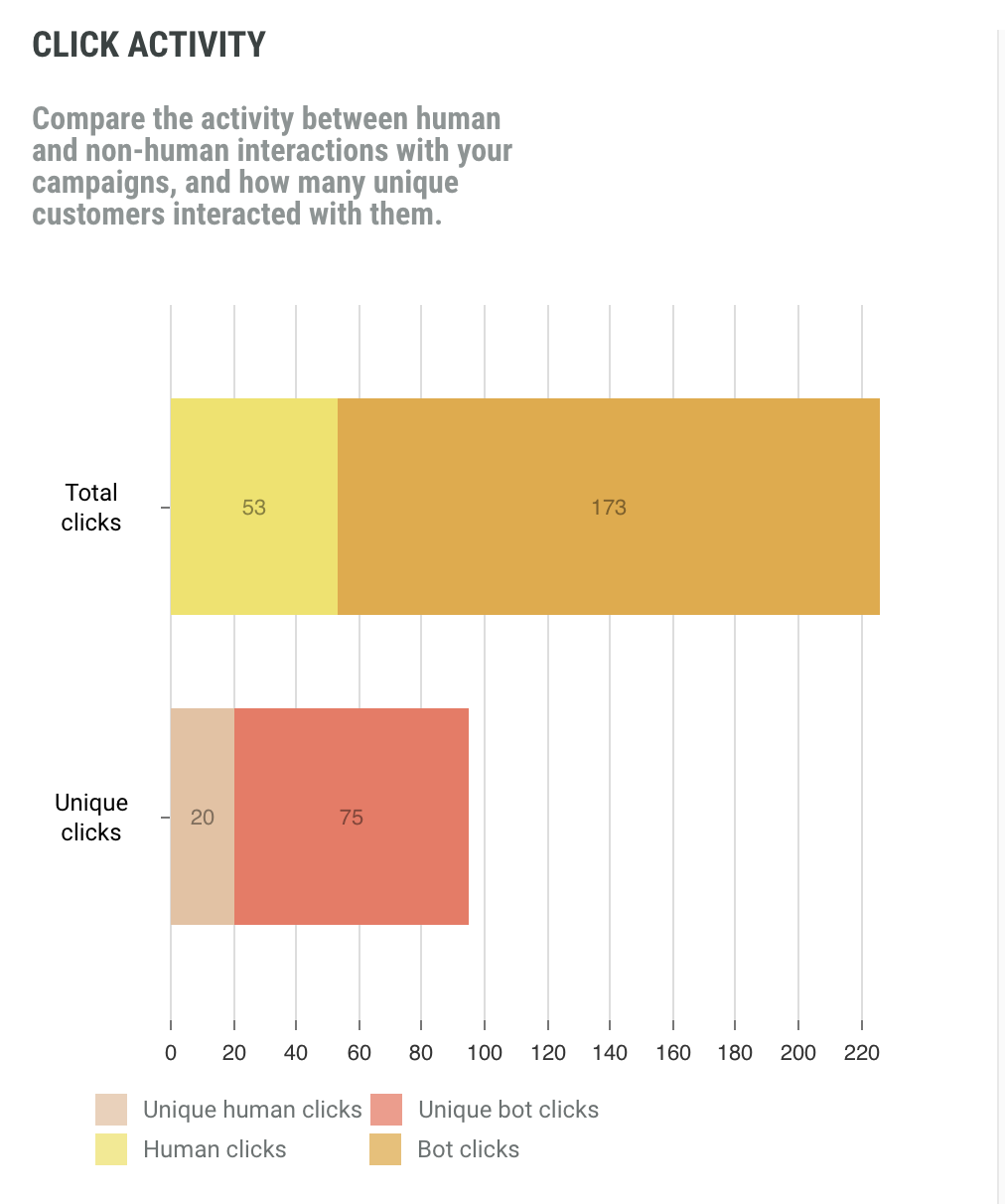The Click Activity report compares human and non-human interactions (clicks) as well as unique vs total clicks.
