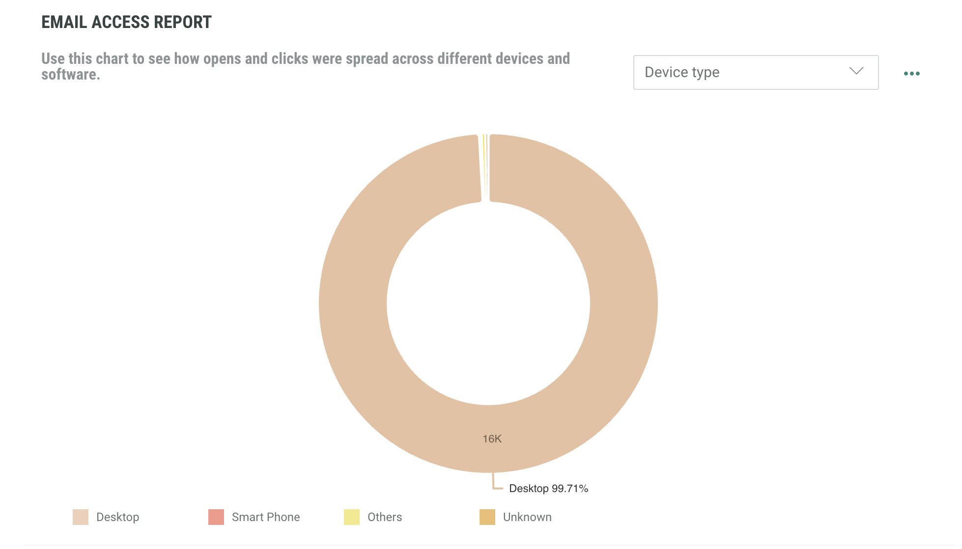The Email Access Report shows how opens and clicks were spread across different devices and software. Select the data you wish to view using the drop down menu and the toggle on the right hand side.