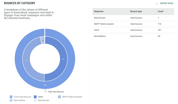 Also, it is good to know what the main reasons are for bounced emails. A dedicated graph Bounces By Category splits up the bounce information per type of bounce (bad domain, inactive mailbox, spam related, routing errors, etc.)