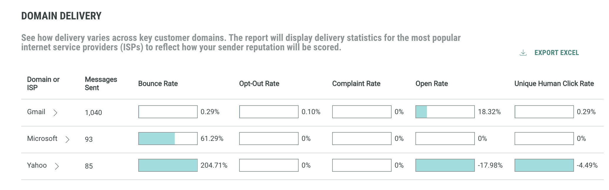 Next, the Domain Delivery report shows delivery numbers for individual ISPs. This allows comparing delivery numbers for key customer domains.