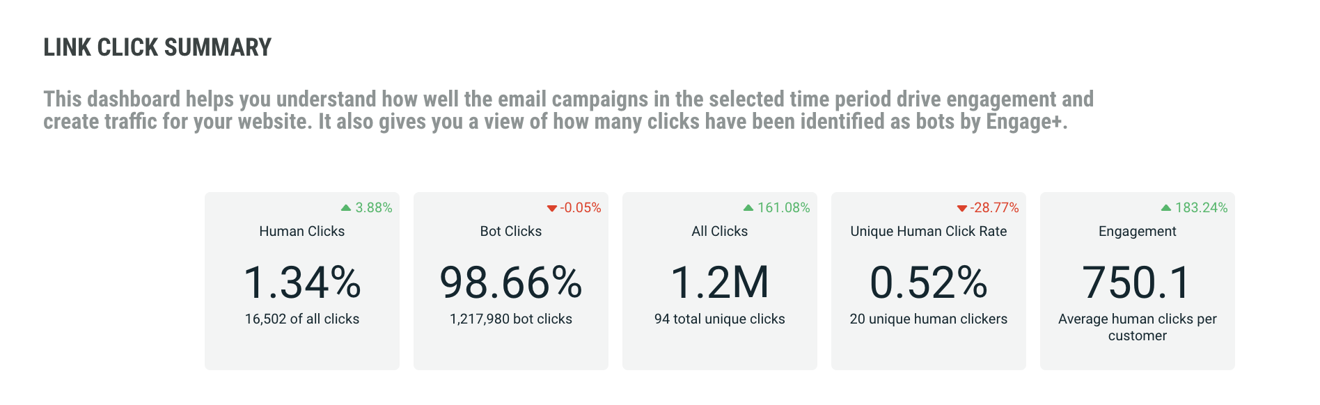The Link Click Summary report provides insights on how much engagement and traffic your campaigns are generating over the selected time period. The following KPI are provided: