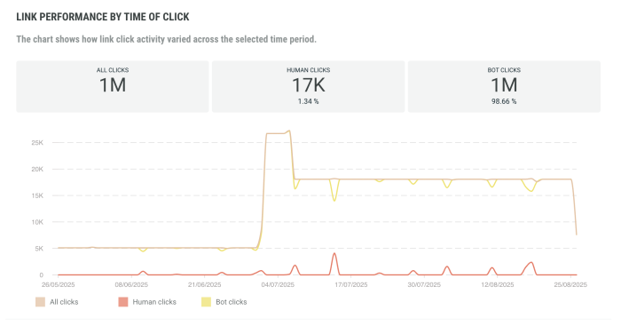The Link Performance By Time of Click is a time line of click activity, showing how click activity varies over the selected time period. Human clicks, bot clicks as well as the total number of clicks are included.