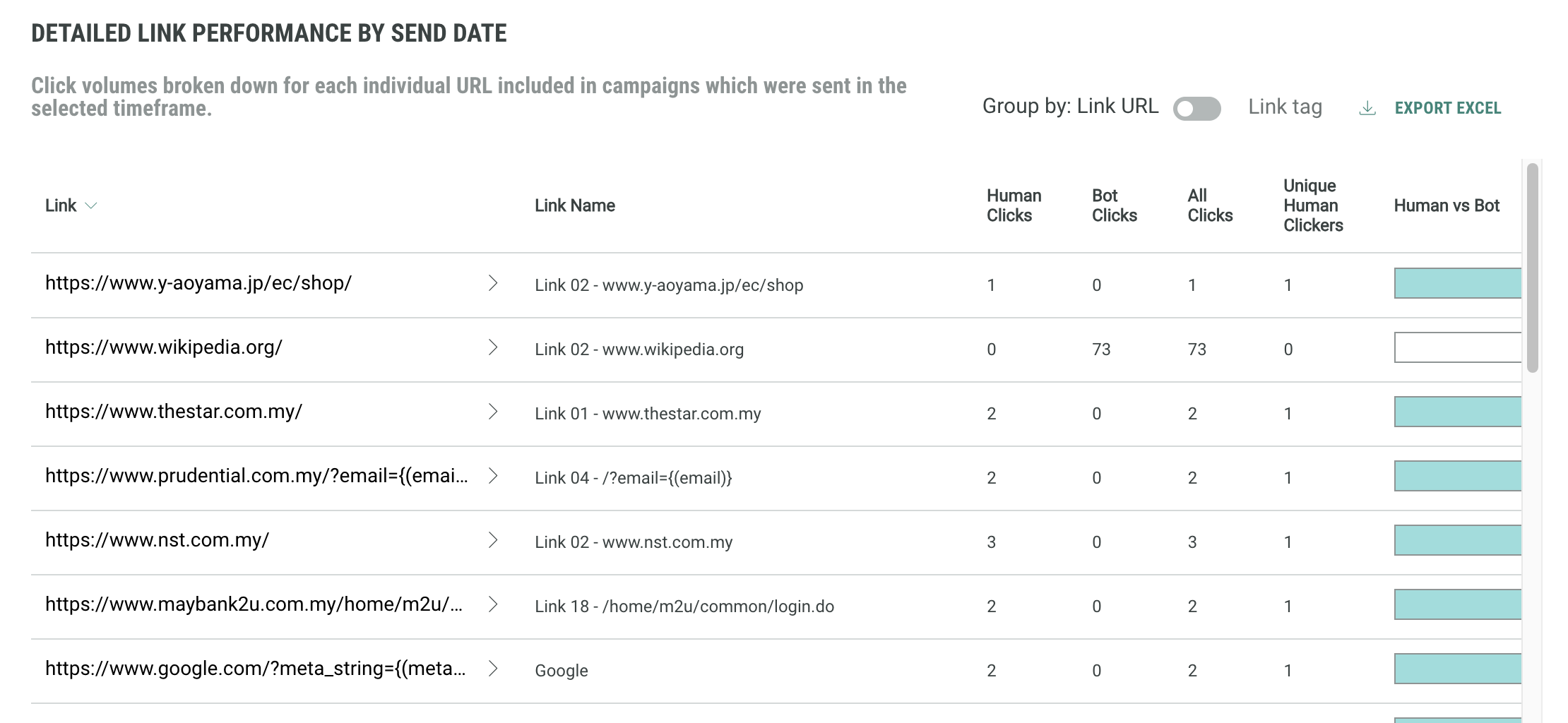 If you are interested in click behavior for individual links, the table view Detailed Link Performance By Send Date is provided, showing per individual link the number of human clicks, non-human clicks, total clicks, unique clicks, as well as the human vs bot ratio. You can click on the arrow to view further details on individual links when the links are grouped by link URL or tag.
