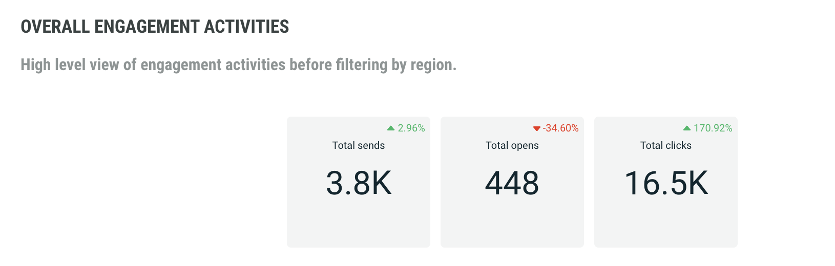 Overall Engagement Activities is a high level view of key performance indicators across all regions. It includes total sends, total opens and total clicks.