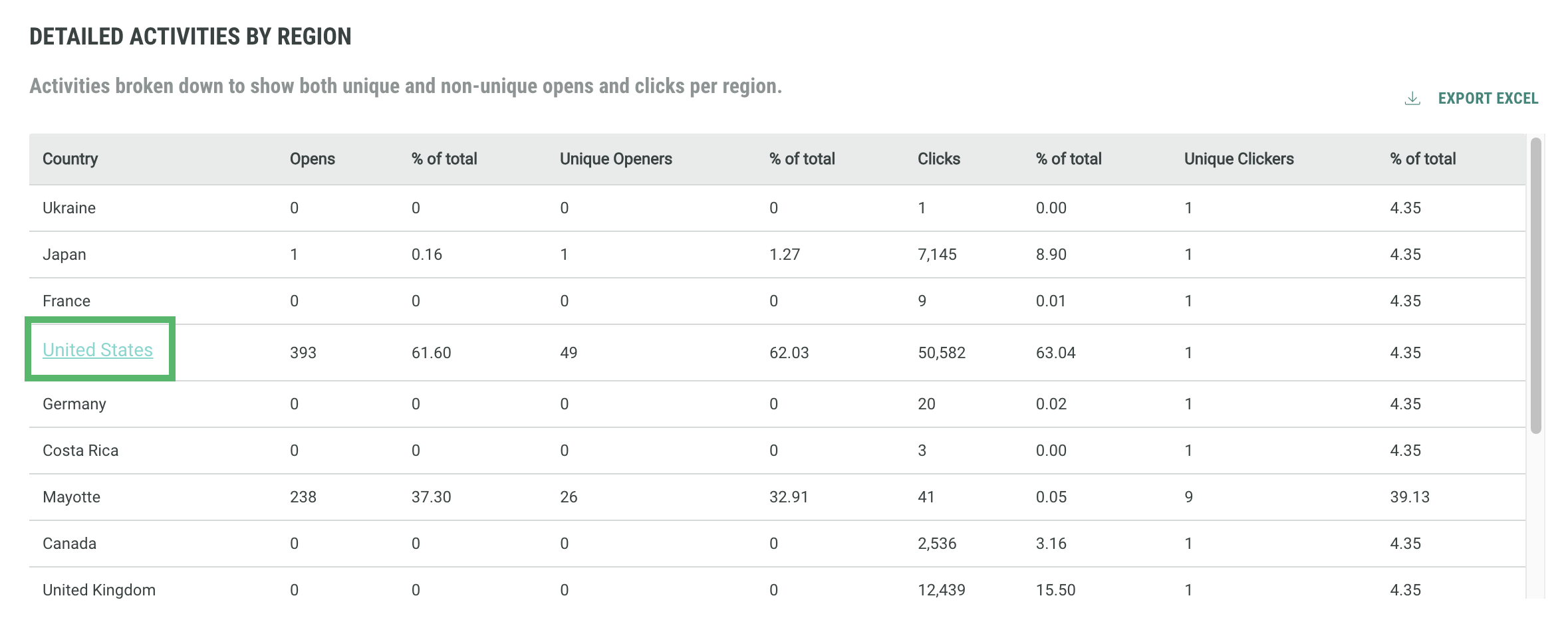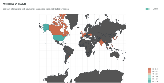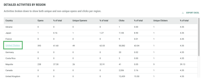 Are your campaigns doing well in one region and not in another? Should you change your approach for specific regions where engagement is low compared to others? The Geography report allows you to compare engagement over the different countries.
