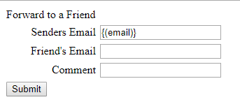 The following code represents the minimum required information needed to successfully use the Forward-to-a-Friend feature. This code doesn't include any formatting, stylesheets, branding, or field validations, all of which can be added as needed.