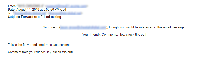 The platform deploys an email message to the friend's email address, containing the Viral format version. The platform uses a special template for this forwarded message that consists of a statement at the top of the message content with the original recipient's email address, and his or her comment.