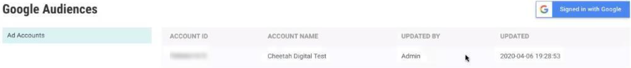 8. The selected Ad Account (or Accounts) is displayed on the Google Audiences screen.