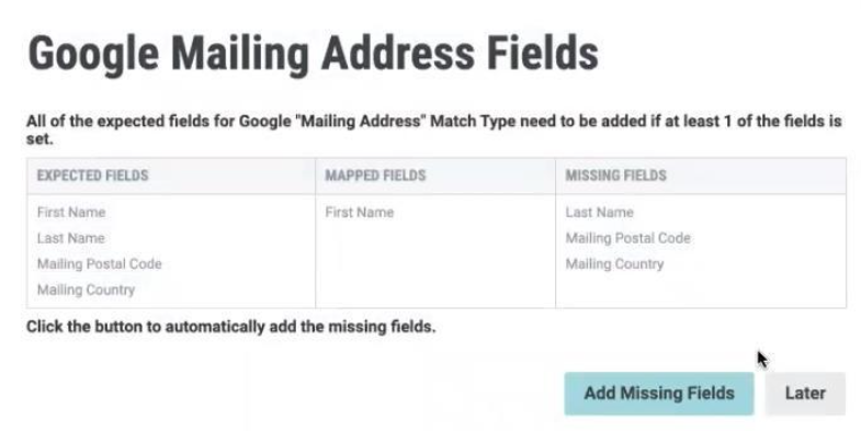 For example, let's say you select Email as the match type, then decide to manually add a "First Name" field. Because "First Name" is part of the Mailing Address match type, the platform will require you to also add all of the other Mailing Address required fields. You'll be prompted with a dialog box, telling you what fields are missing.