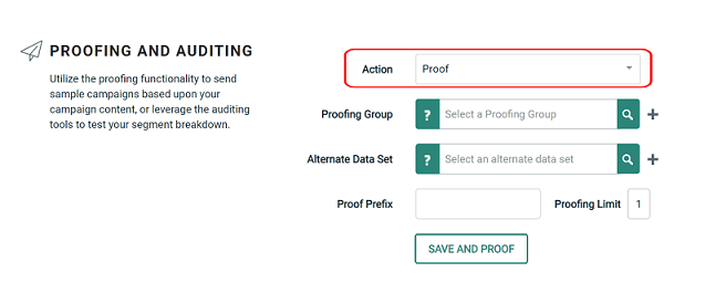 Note: Optionally, you can send proofs and run audit counts at the same time by selecting Audit and Proof from the Action drop-down menu.
