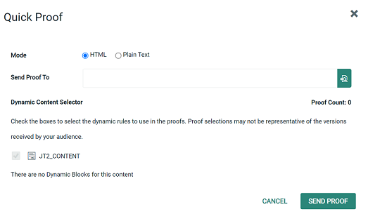 Note: The Proof Count field indicates how many proofs will be sent to each recipient. The system imposes a hard limit of 250 proofs to each recipient. If you surpass this threshold, you must reduce the number of selected Dynamic Content variants in order to decrease the Proof Count.