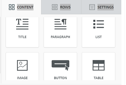 - Content: Select and edit the specific content elements that make up your message, such as buttons, images, personalization, text blocks, etc.