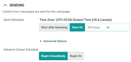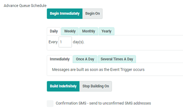 Campaigns can be deployed immediately, or scheduled to deploy at a date and time in the future. To schedule a Campaign, two components must be set: the message creation time (also called the "Advance Queue Schedule") and the send time.