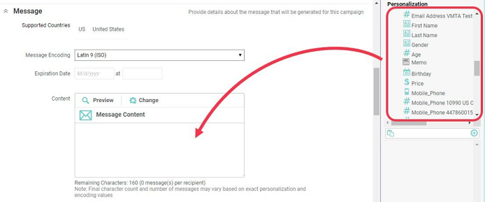 4. At the top of the Personalization Panel, select an item to be used in the SMS message. An item from the Personalization Panel can be added by: