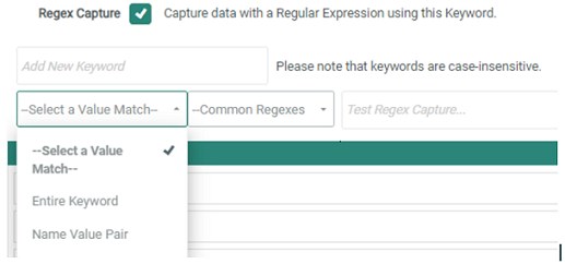 4. To test the regex syntax, enter a value in the "Test Regex Capture" field, then click Test Regex. In the pop-up, the platform indicates whether that value would be captured or not.