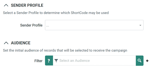 The Sender Profile defines the shortcode from which the Campaign will be sent, and also controls the recipient's eligibility to be contacted. The Filter defines the target audience for the Campaign, and it is required for Date-triggered and Regular One-off Campaigns. If you're creating an Event-triggered Campaign, selecting a Filter is optional; the audience will be automatically set to “all triggered records.”