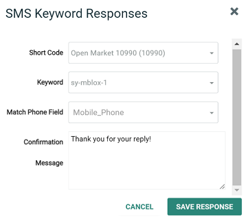 If a recipient replies to an SMS Text Campaign, and the reply contains a designated keyword, you can configure an automated reply back to that recipient.