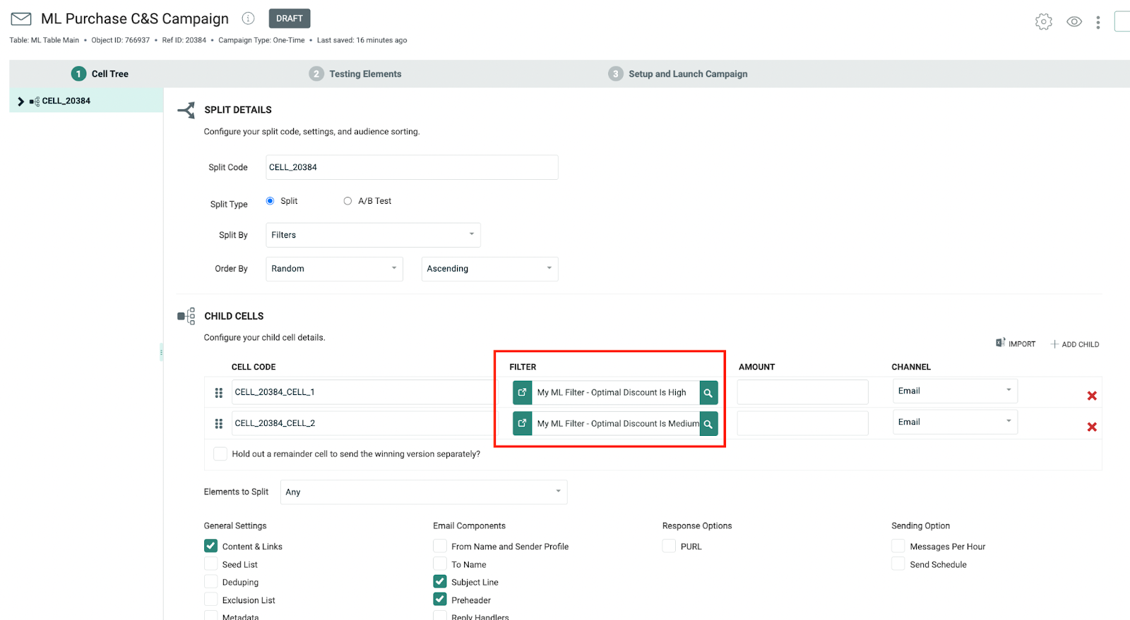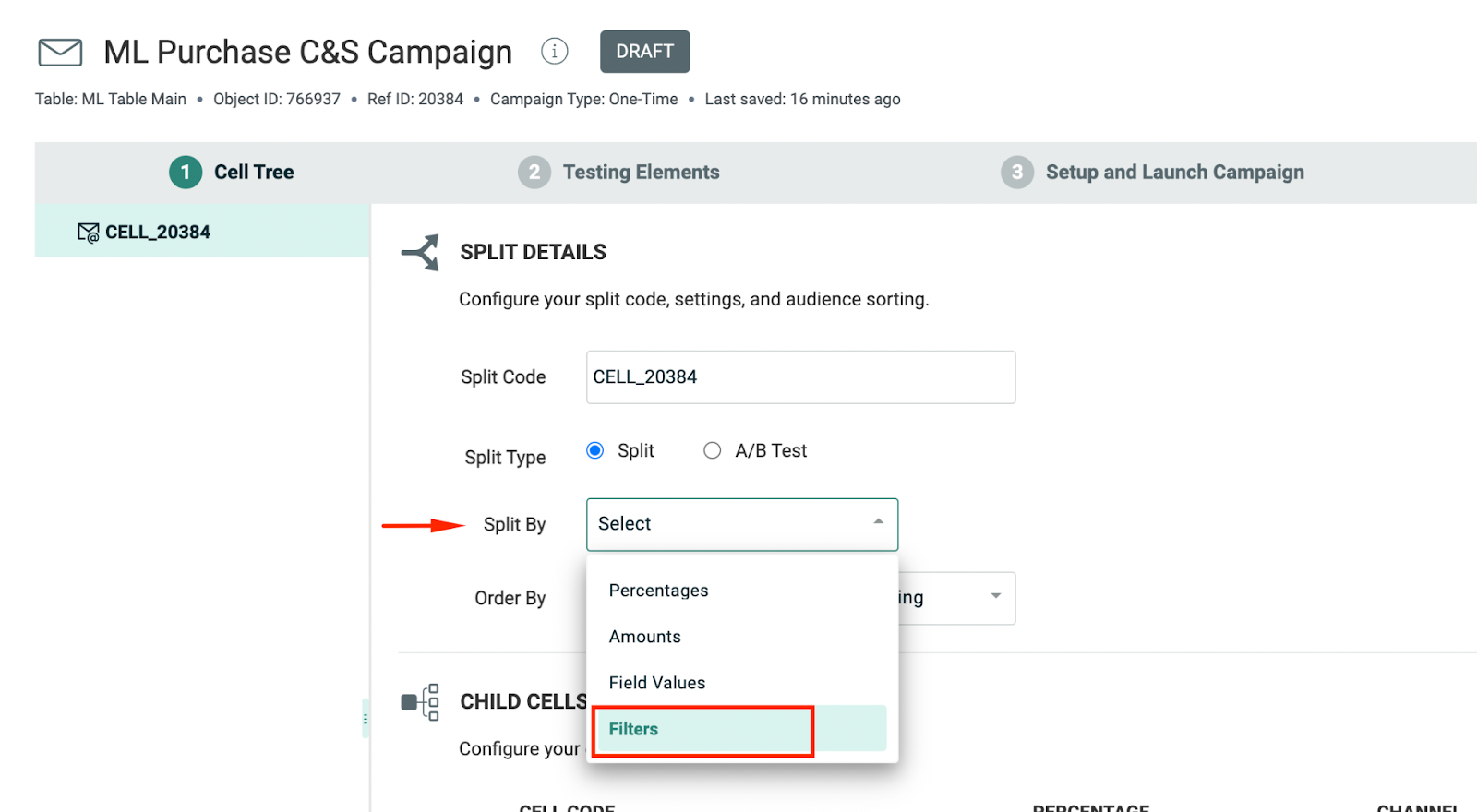 To use the filters created in the above section in a Split Cells Campaign, split the campaign by filter. This enables you to use the Filter to define the Audience for each sub-cell as shown in the screenshots below.