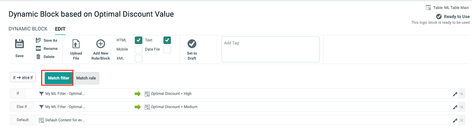 To use the filters created in the above section in a dynamic block, use the Match Filter option. This enables you to apply the filters based on discount values and break the campaign audience into smaller, unique groups, so each of these can receive unique content or offers.