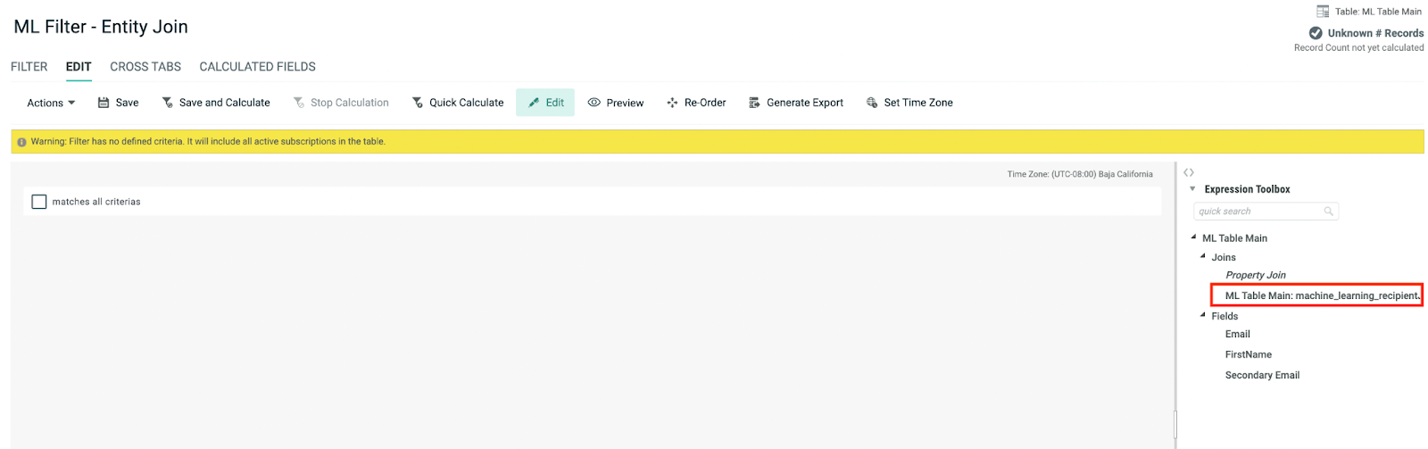 When the ML models for Personalized Send Time and Likelihood to Engage are enabled in your account, the Machine Learning Recipient Table will be available in the filter for entity joins.