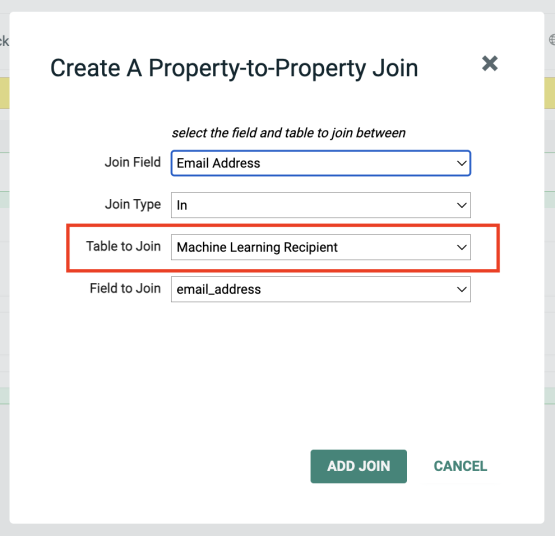 In the displayed popup window enter select “email_address” as the field to join and Machine Learning Recipient as the Table to Join.