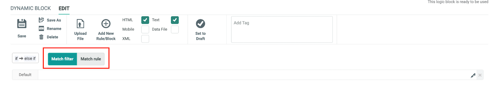 To use the filters created in the above section in a dynamic block, use the Match Filter option. This enables you to apply the filters based on discount values and break the campaign audience into smaller, unique groups, so each of these can receive unique content or offers.