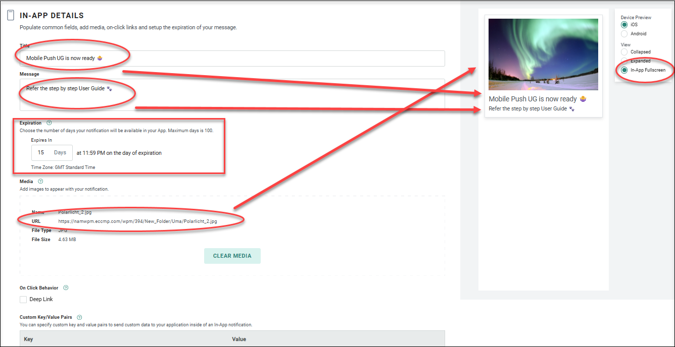 In the In-App Details section, provide the required information as above and in addition enter the number of days for the message to be available in your app in the Expiration field.