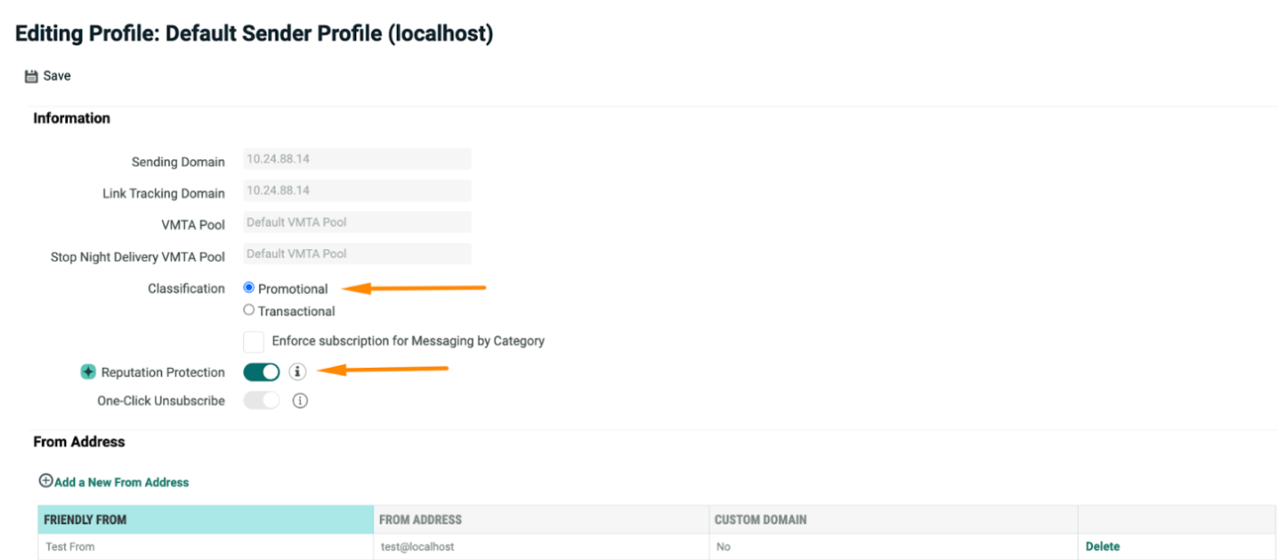 If the Sender Profile is of “Promotional” Classification, then you’ll see the new option to configure Reputation Protection.