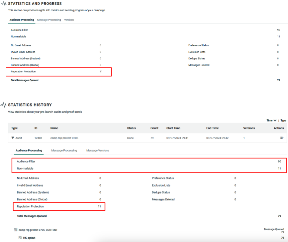 When a campaign is launched with Reputation Protection, you will see the Reputation Protection exclusion stats in the Audience Processing tab.