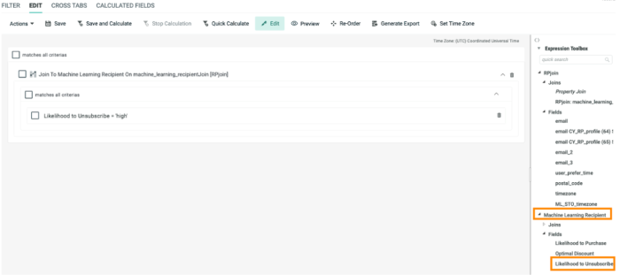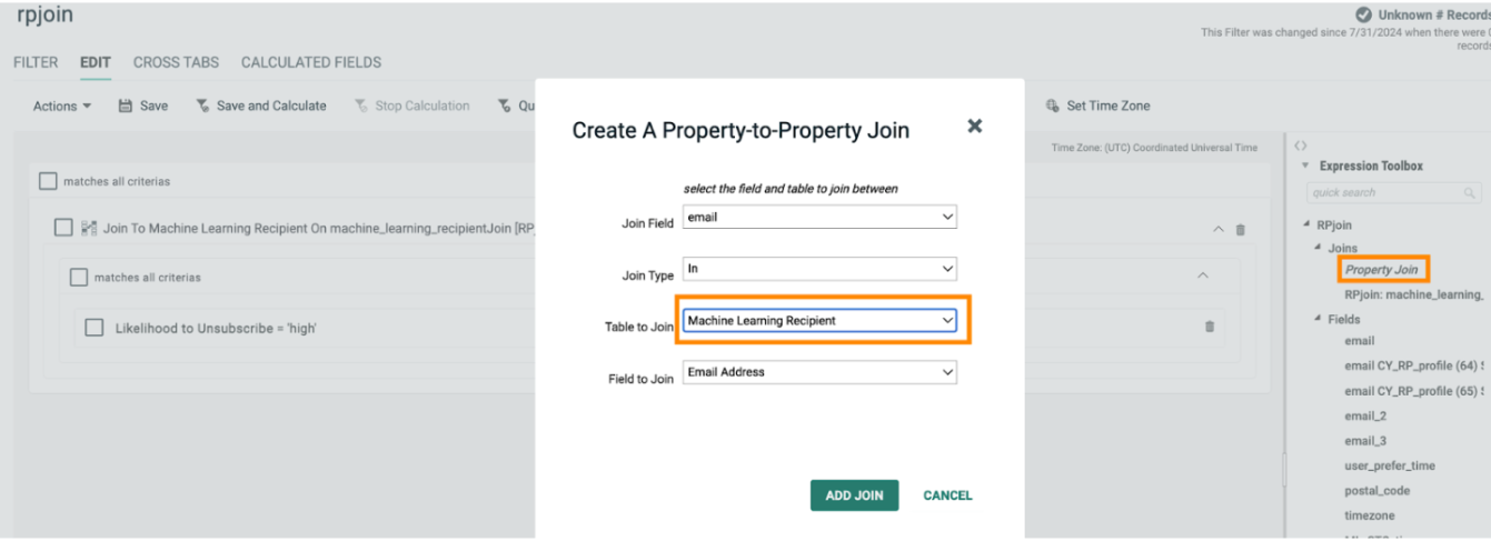 To join the current table to the Machine Learning Recipient (AI Profile) Table, from the Expression Toolbox in the right pane, select the customer table (Recipient table in the above example) > Joins > Property join, then drag and drop the Property Join to the Filter.