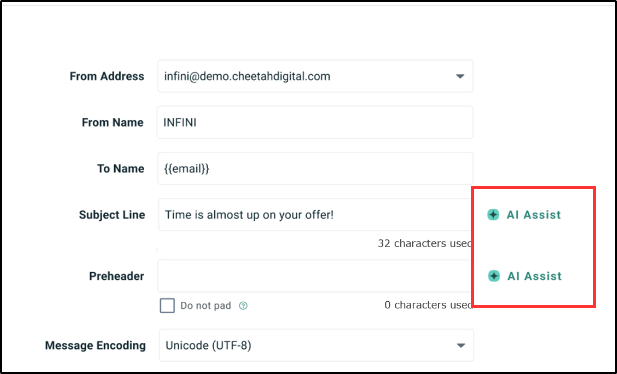 To use this feature, you have an AI Assist button next to your Subject line and Preheader fields in the Campaign Setup tab.