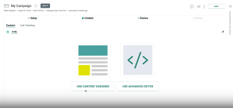 Content Designer is the powerful no-code drag and drop editor that is included with your Cheetah Digital license. If Content Designer is turned on, when you are on the Content tab in a new campaign, you will be asked if you want to proceed by using Content Designer, or the Advanced Editor. If Content Designer is not turned on, you will be taken directly to the Advanced Editor where you will work directly in HTML.