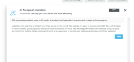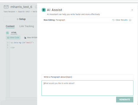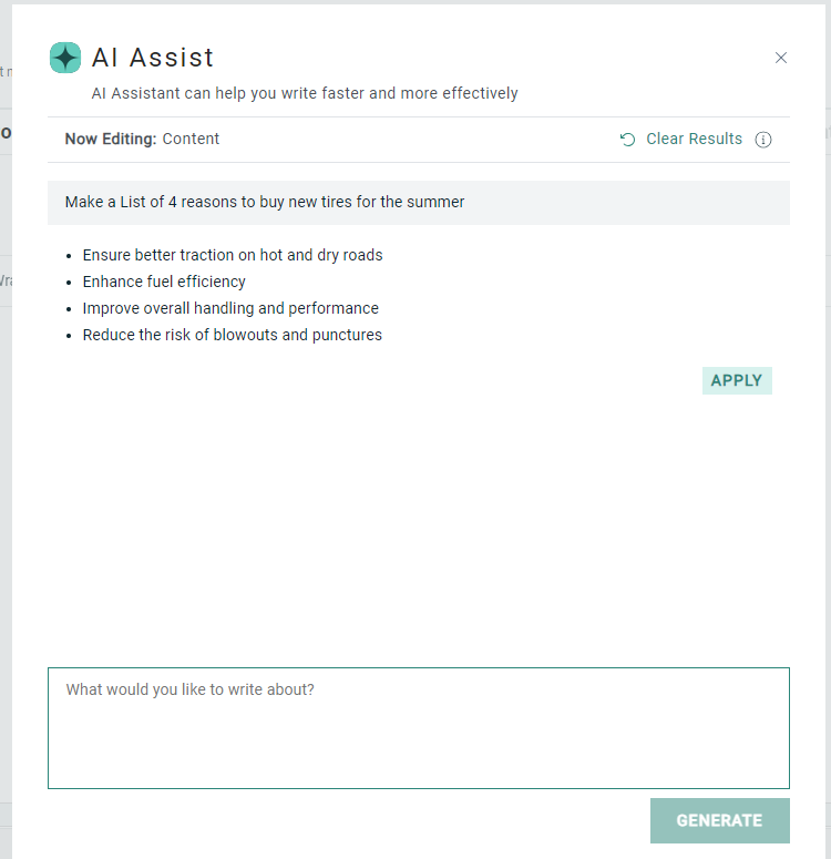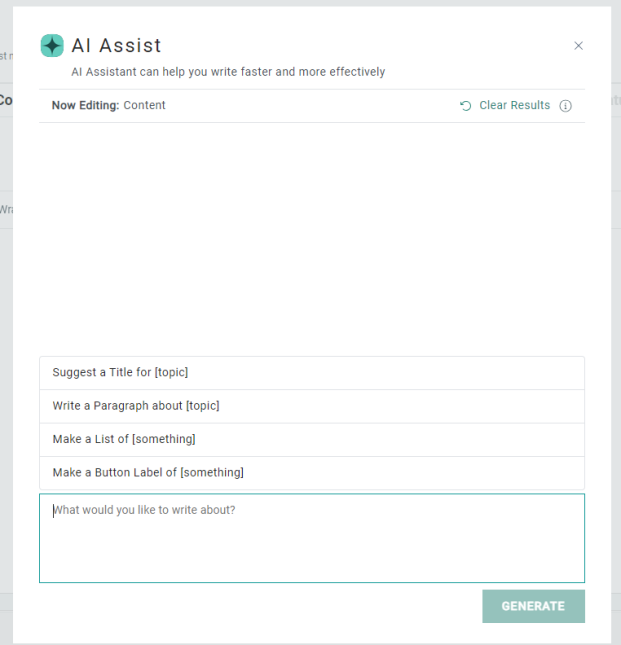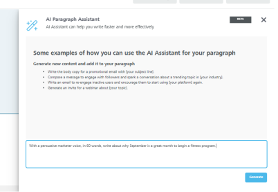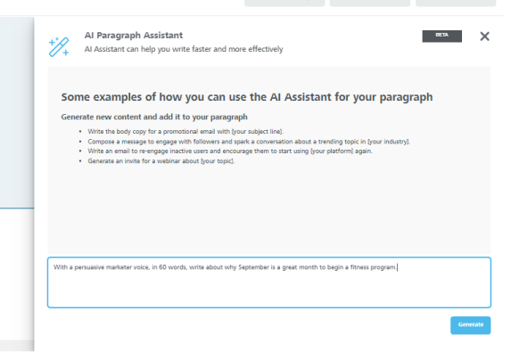 Enter what you would like the Assistive AI to write about and click on Generate. See above for best practices for prompts and using AI to write marketing copy.