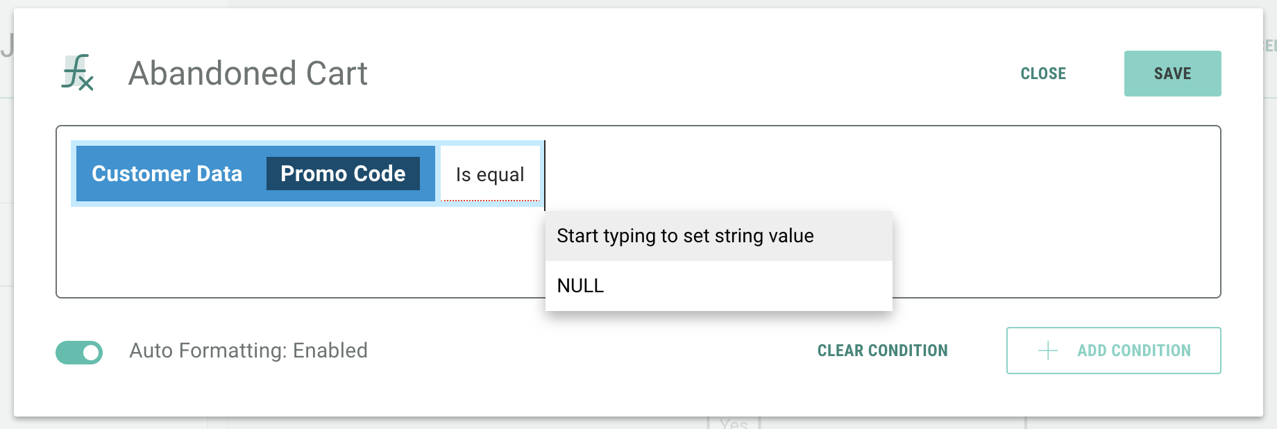 • Auto-Formatting Enabled: also known as the Basic Editor. This mode will provide prompts and dropdowns to help build each expression. Best used for simple expressions.