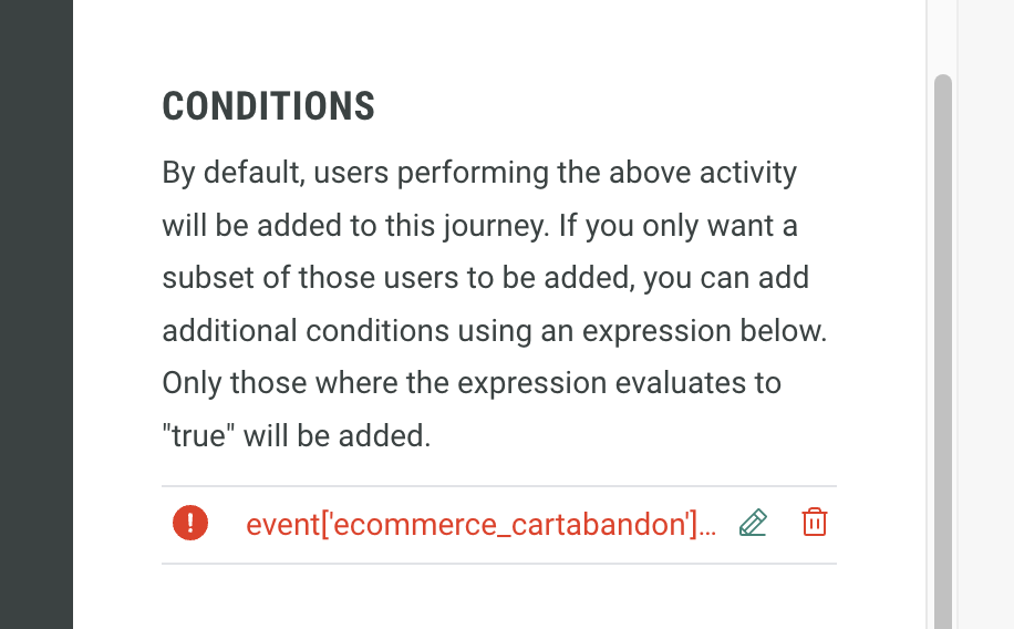 If the conditions are invalid, the name of the expression will turn red in the edit pane, and a red exclamation mark (!) will appear next to it. You will need to correct the invalid expressions before publishing your Journey.