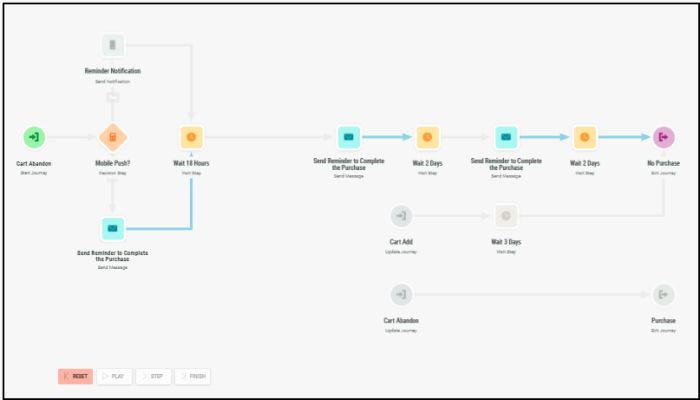 Click Play to see the user travel through the Journey, based on the attributes and personalized data. Alternatively you can use Step, or Finish.