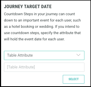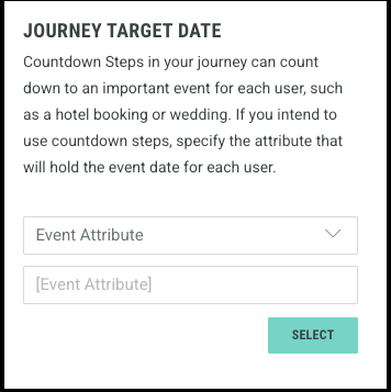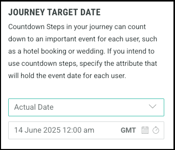 Select a target date for your Journey. The Countdown steps in your Journey can count down to an important event for each user, such as a hotel booking or wedding. If you intend to use Countdown steps, specify the target date or attributes that will hold the event date for each user.