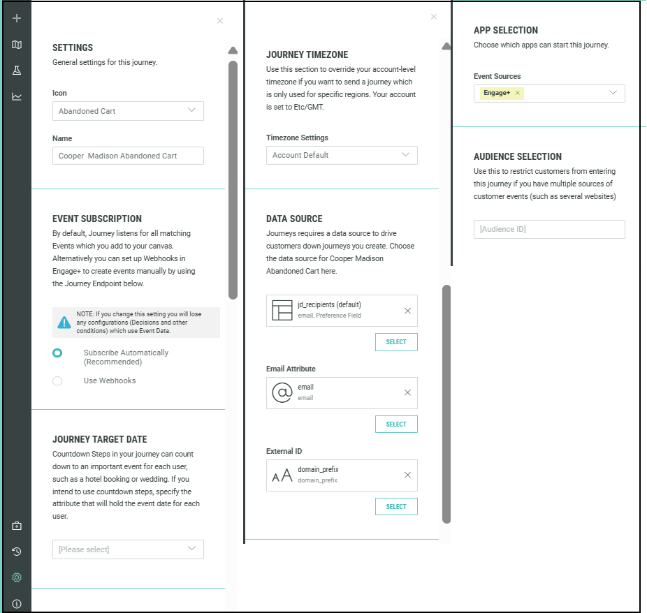 The Journey must be configured with the correct settings. From the left menu, select Journey Settings. These settings are specific for the Journey, and will override any settings made at the account level.