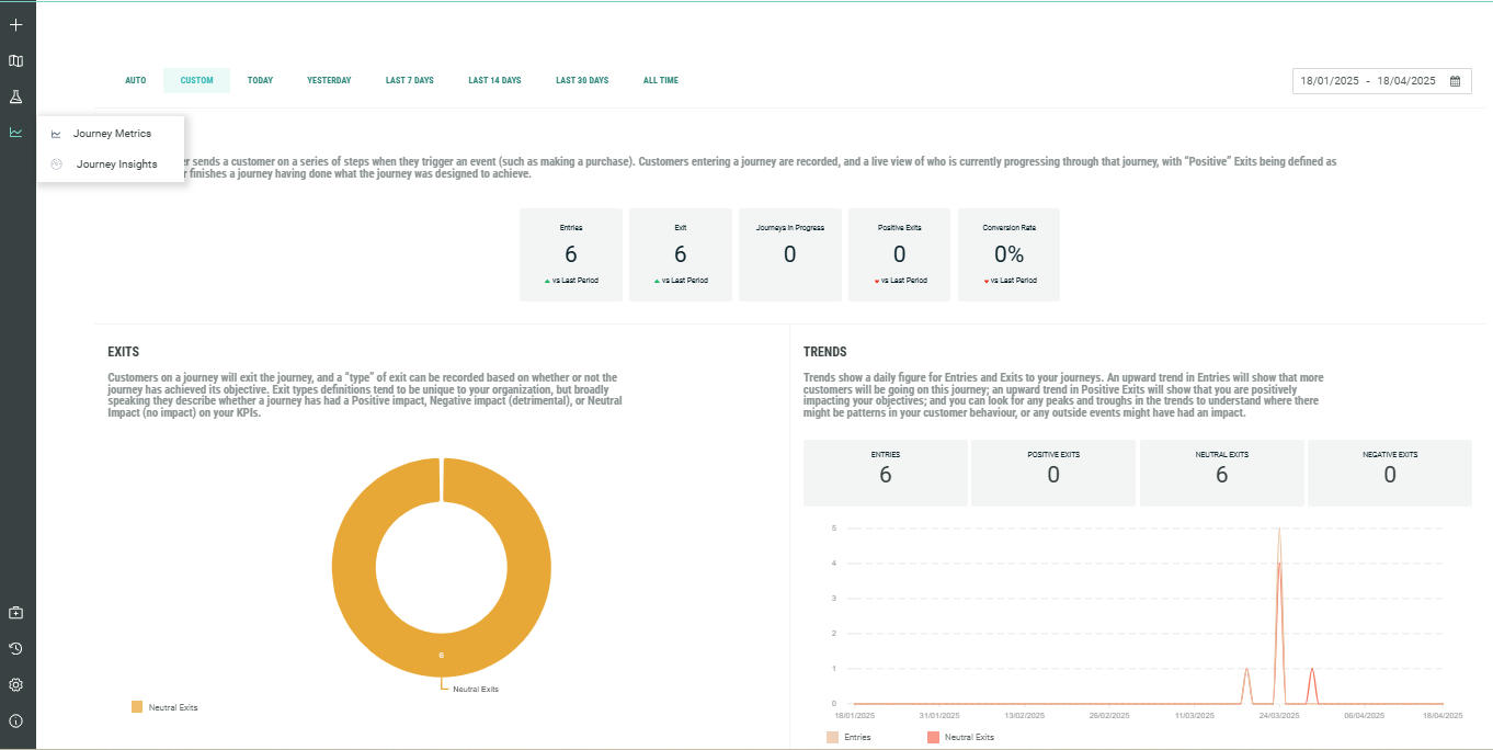 Trends: Provides trending chart of entries and exits in the Journey. An upward trend in the Entries shows that more customers are going on this Journey; an upward trend in Positive Exits shows that you are positively impacting your objectives. Any peaks and troughs in the trends help you to understand where there might be patterns in your customer behaviour, or any outside events might have had an impact.