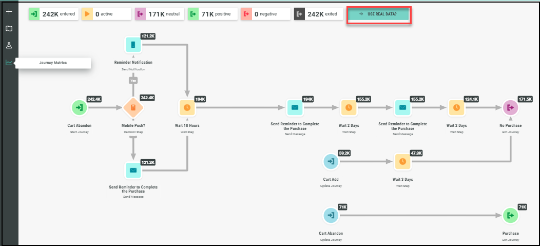 You can click Use Example data? button if there is no real time data or the Journey is still in Draft state and yet to be published. You can always toggle back to use real data.